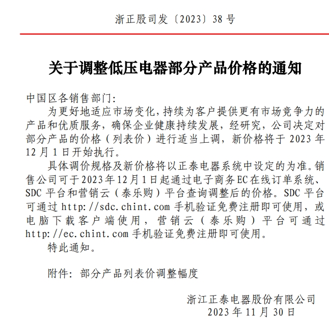 關(guān)于調(diào)整低壓電器部分產(chǎn)品價(jià)格的通知
