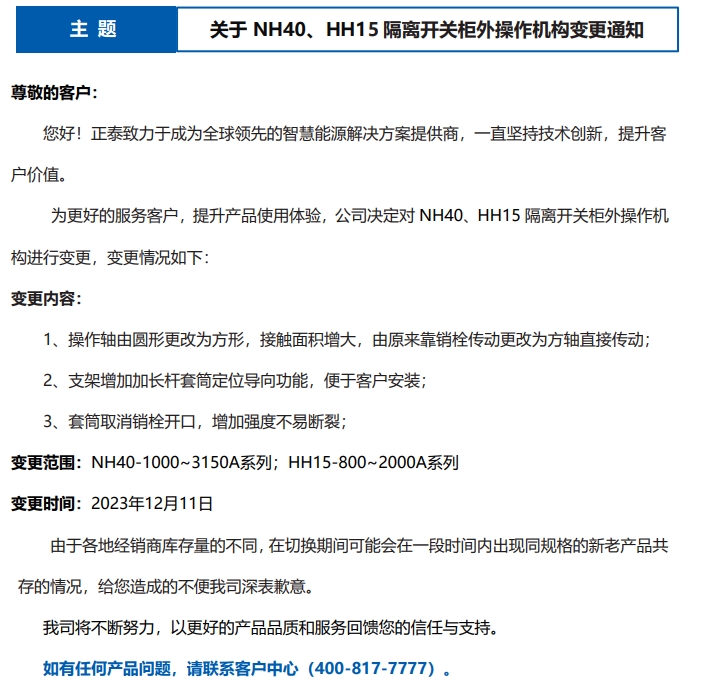 關于 NH40、HH15 隔離開關柜外操作機構變更通知