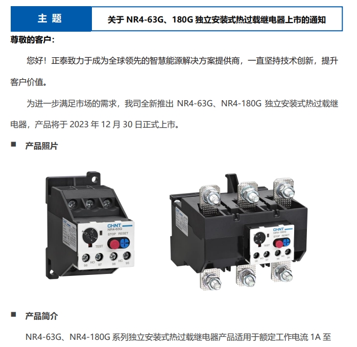 關(guān)于 NR4-63G、180G 獨(dú)立安裝式熱過載繼電器上市的通知