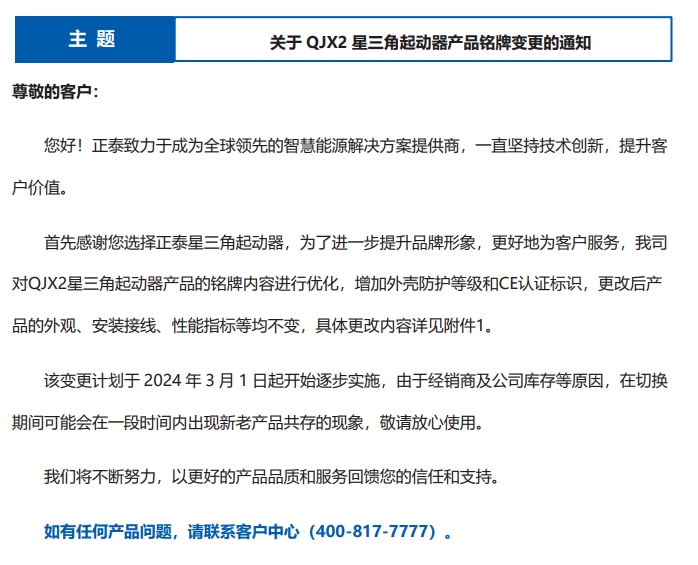 關(guān)于 QJX2 星三角起動器產(chǎn)品銘牌變更的通知