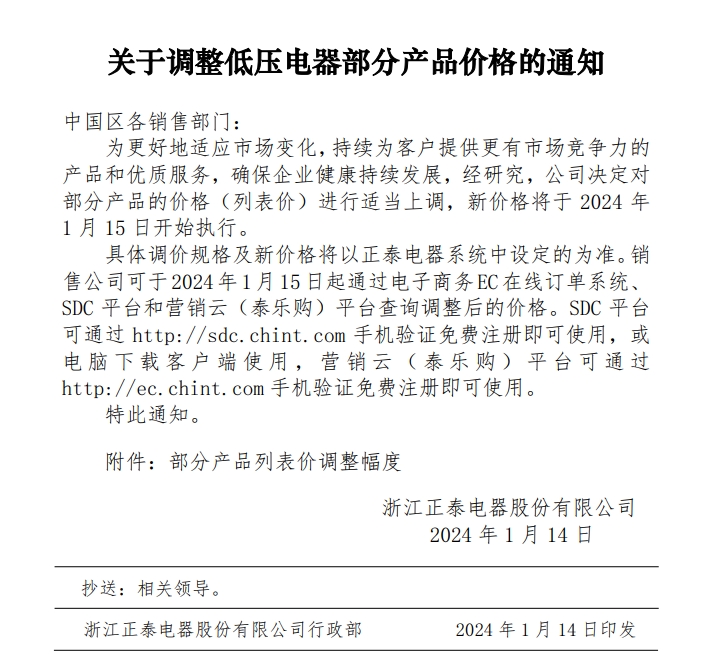關(guān)于調(diào)整低壓電器部分產(chǎn)品價(jià)格的通知