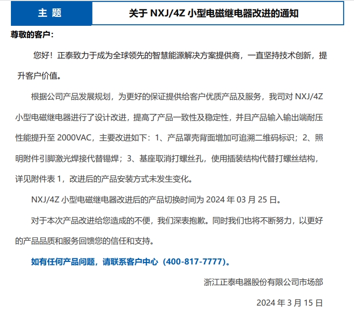 關(guān)于 NXJ/4Z 小型電磁繼電器改進的通知