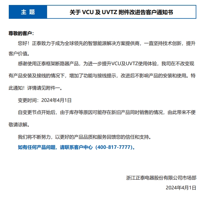 關(guān)于 VCU 及 UVTZ 附件改進告客戶通知書