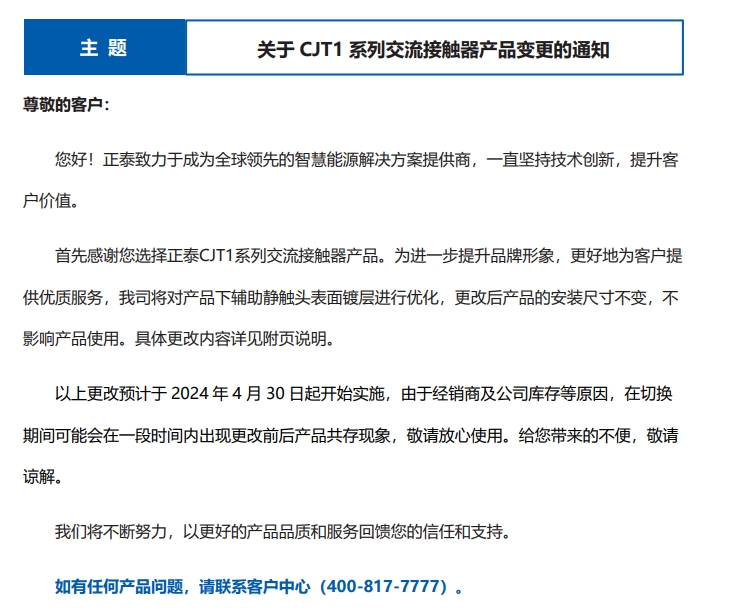 關(guān)于 CJT1 系列交流接觸器產(chǎn)品變更的通知