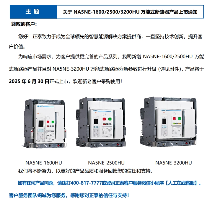 關于 NA5NE-1600/2500/3200HU 萬能式斷路器產(chǎn)品上市通知