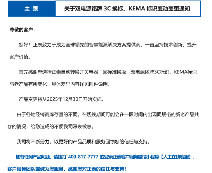 關于雙電源銘牌 3C 換標、KEMA 標識變動變更通知