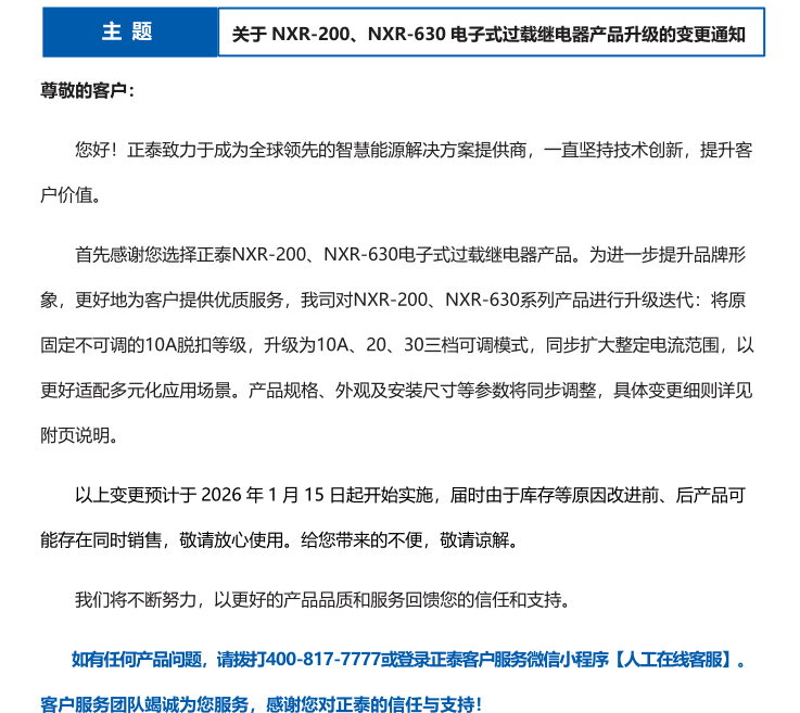 關(guān)于 NXR-200、NXR-630 電子式過(guò)載繼電器產(chǎn)品升級(jí)的變更通知