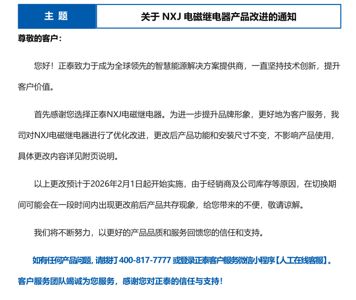 關于 NXJ 電磁繼電器產(chǎn)品改進的通知