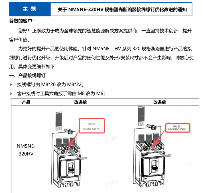 關(guān)于 NM5NE-320HV 規(guī)格塑殼斷路器接線螺釘優(yōu)化改進的通知
