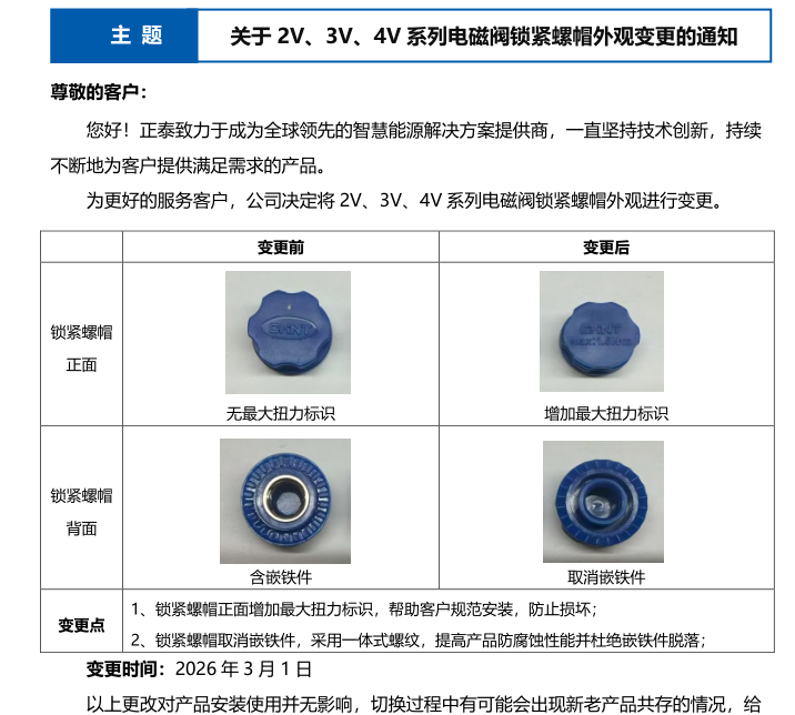 關(guān)于 2V、3V、4V 系列電磁閥鎖緊螺帽外觀變更的通知
