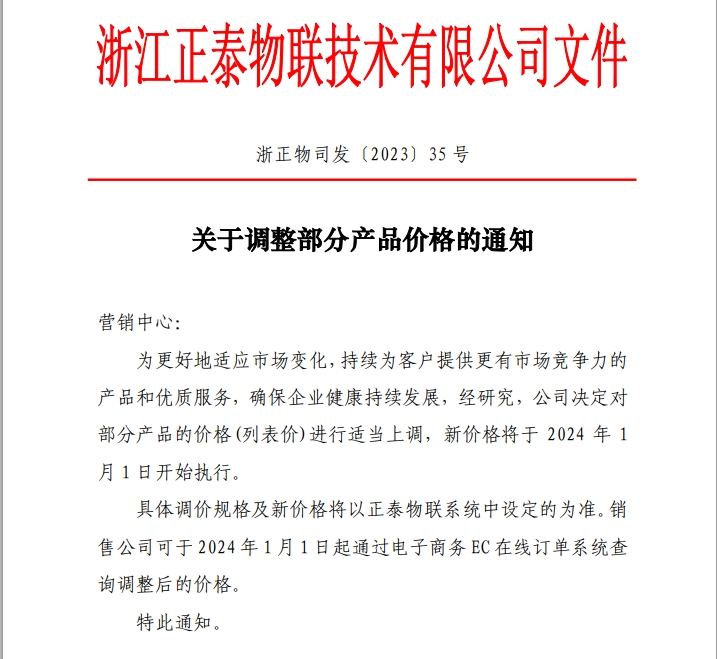 關(guān)于調(diào)整部分產(chǎn)品價格的通知 ——浙正物司發(fā)〔2023〕35 號