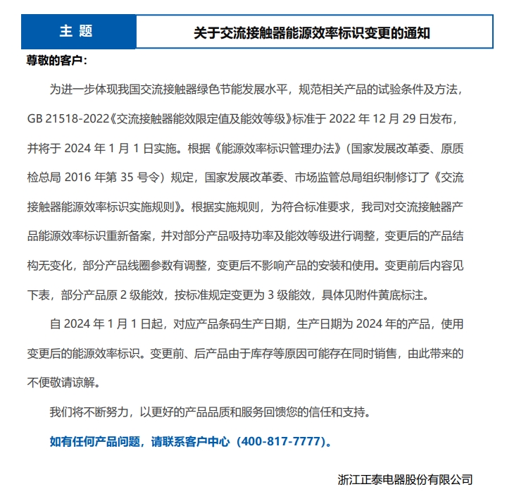 關(guān)于交流接觸器能源效率標(biāo)識(shí)變更的通知