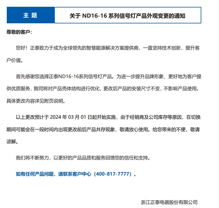 關(guān)于 ND16-16 系列信號燈產(chǎn)品外觀變更的通知
