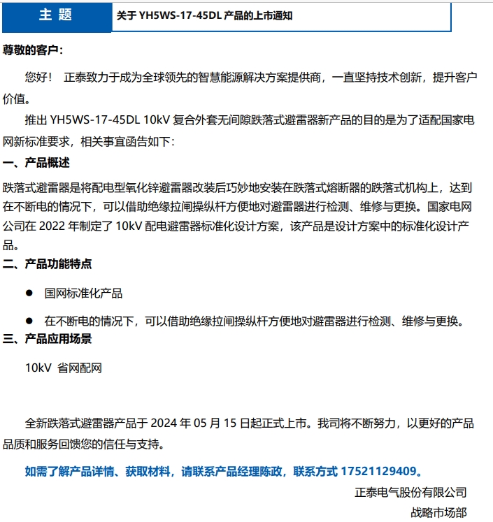 關(guān)于 YH5WS-17-45DL 產(chǎn)品的上市通知