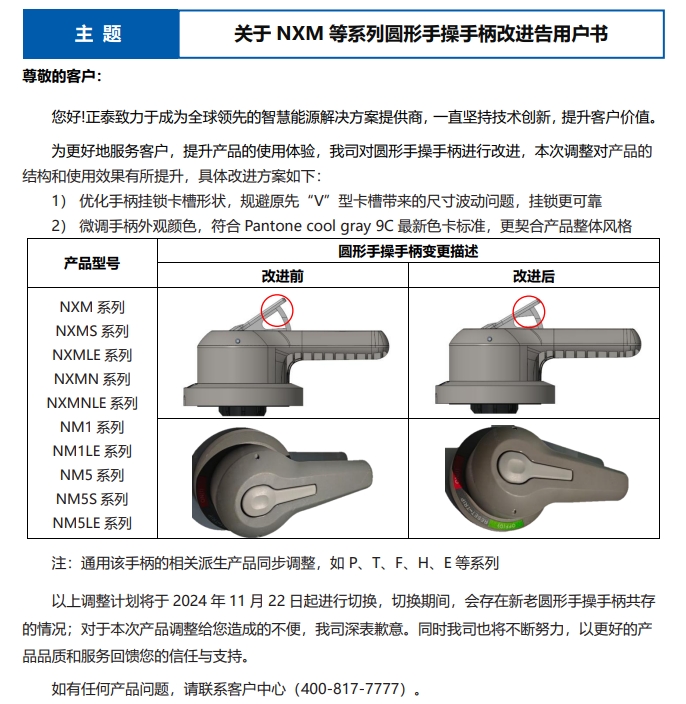 關(guān)于 NXM 等系列圓形手操手柄改進(jìn)告用戶書