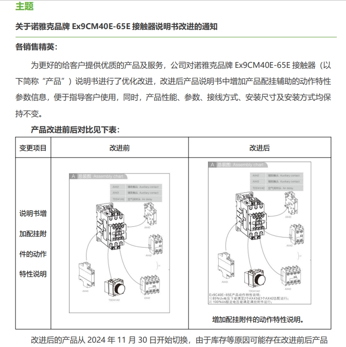 關(guān)于諾雅克品牌 Ex9CM40E-65E 接觸器說(shuō)明書改進(jìn)的通知