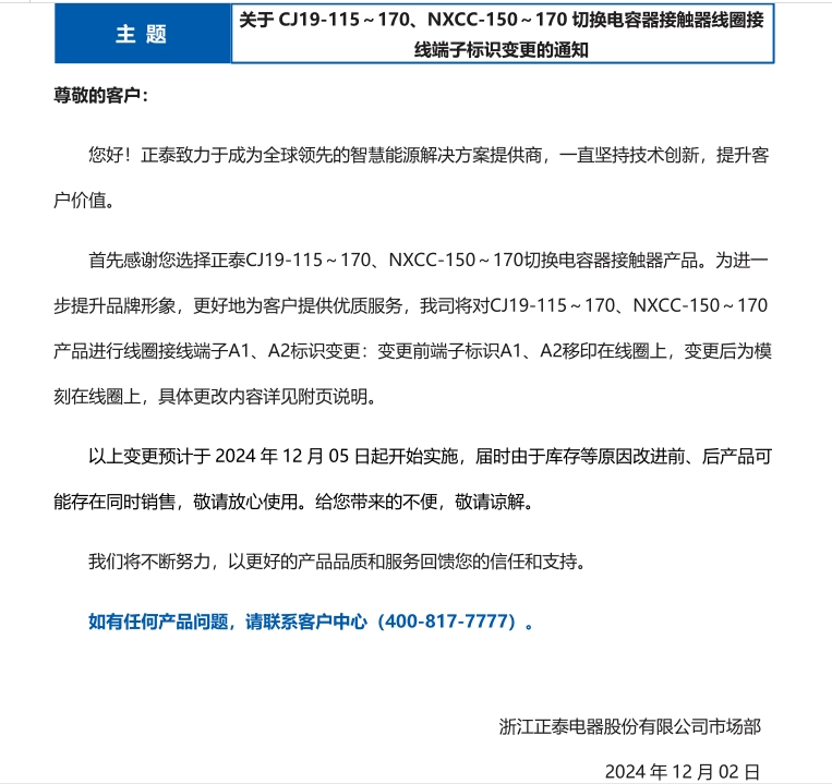 關(guān)于 CJ19-115~170、NXCC-150~170 切換電容器接觸器線圈接 線端子標識變更的通知