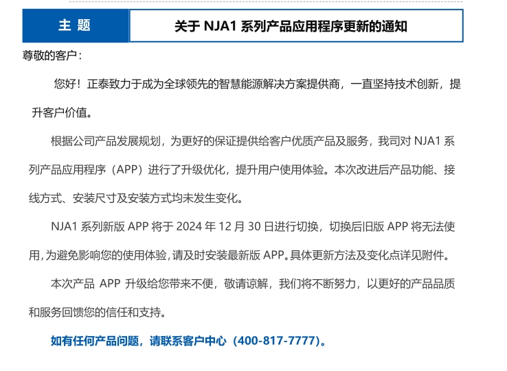 關于 NJA1 系列產品應用程序更新的通知