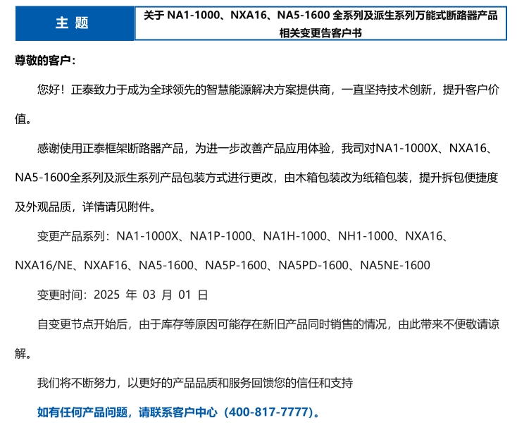 關于 NA1-1000、NXA16、NA5-1600 全系列及派生系列萬能式斷路器產(chǎn)品 相關變更告客戶書