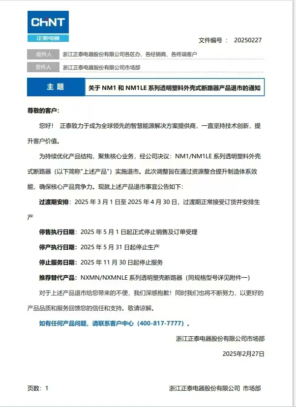 關于NM1和NM1LE系列透明塑料外殼式斷路器產(chǎn)品退市的通知