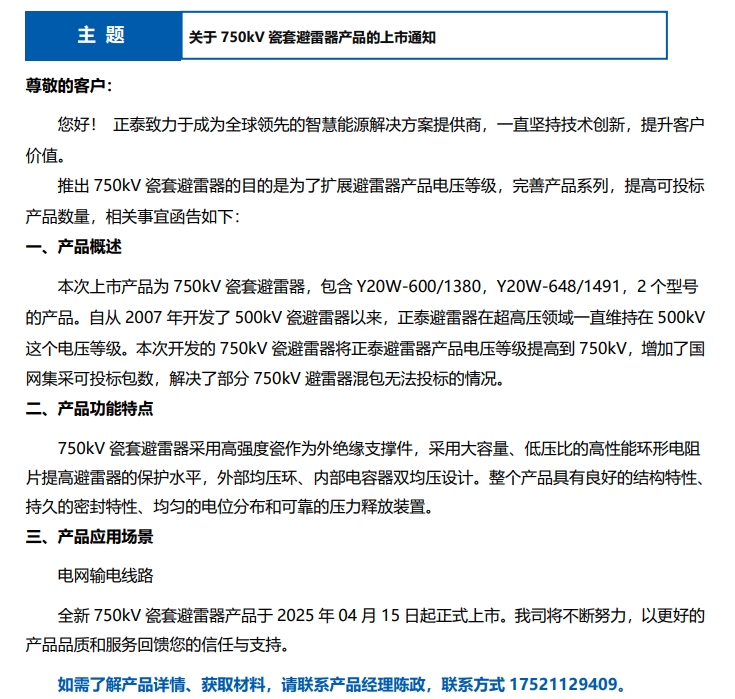 關(guān)于 750kV 瓷套避雷器產(chǎn)品的上市通