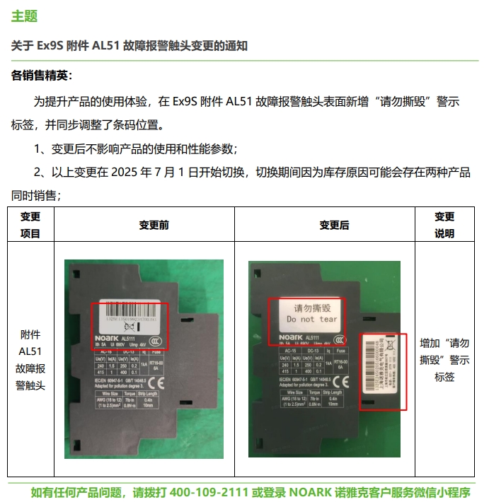 關(guān)于 Ex9S 附件 AL51 故障報(bào)警觸頭變更的通知
