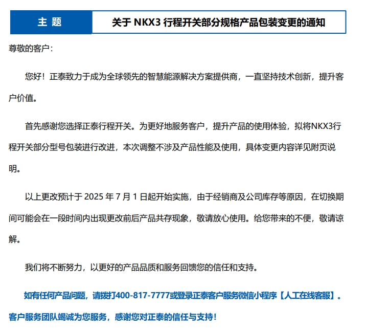 關(guān)于 NKX3 行程開關(guān)部分規(guī)格產(chǎn)品包裝變更的通知