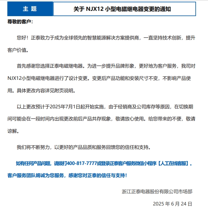 關(guān)于 NJX12 小型電磁繼電器變更的通知