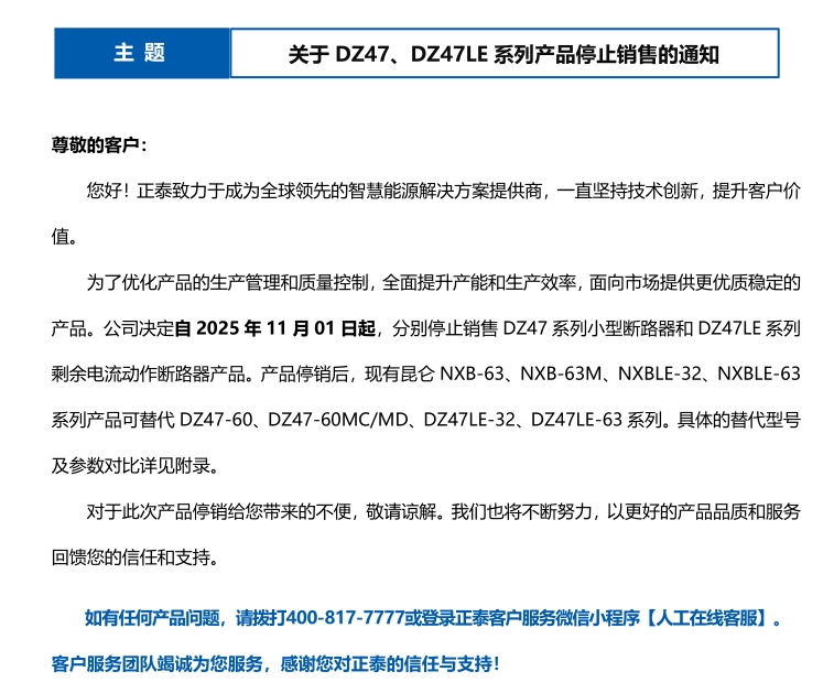 關(guān)于 DZ47、DZ47LE 系列產(chǎn)品停止銷售的通知