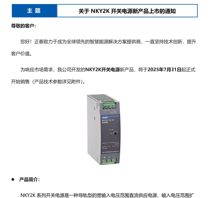 關(guān)于 NKY2K 開關(guān)電源新產(chǎn)品上市的通知