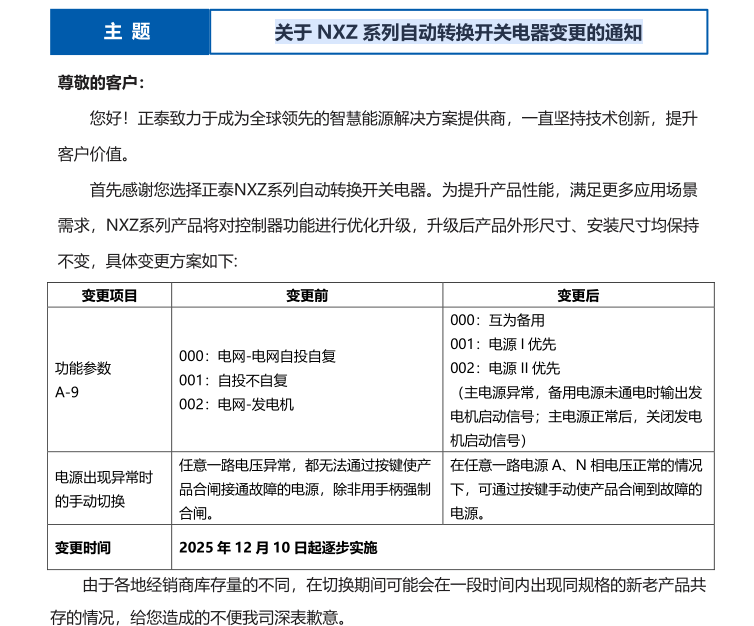 關(guān)于 NXZ 系列自動轉(zhuǎn)換開關(guān)電器變更的通知