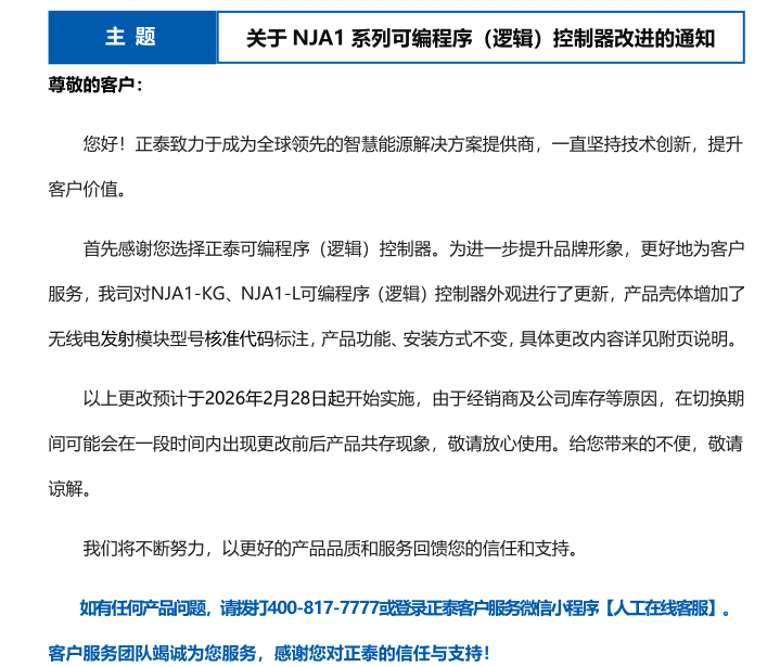 關(guān)于 NJA1 系列可編程序(邏輯)控制器改進的通知