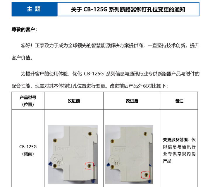 關(guān)于 CB-125G 系列斷路器鉚釘孔位變更的通知